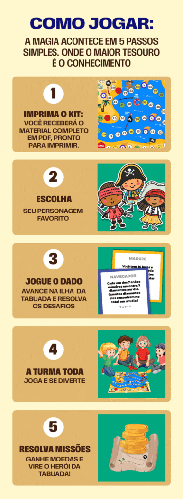 A “ILHA DA TABUADA” é perfeito para crianças do Segundo ao Quinto Ano. Ele serve tanto para quem está começando a ter os primeiros contatos com as letras e números (pré-alfabetização) quanto para quem já está no processo de ler e escrever sílabas e palavras simples.